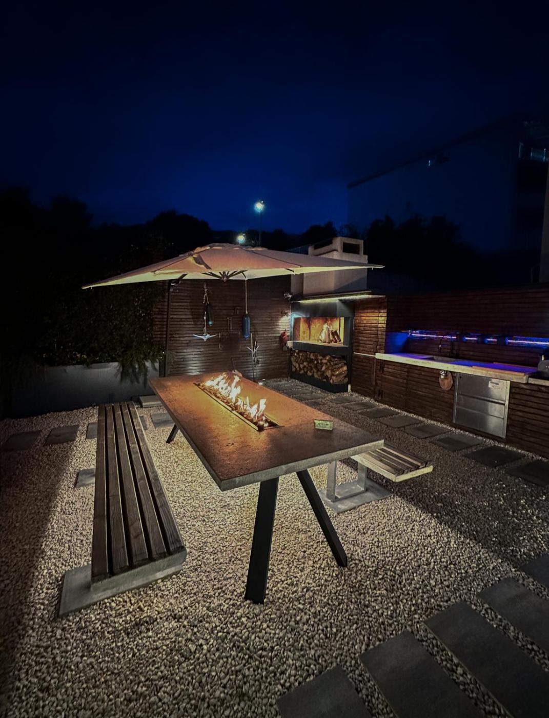 Guests can also warm themselves near outdoor fireplace after a day of cycling.
