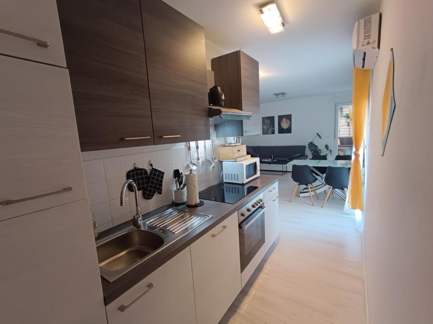One-Bedroom Apartment. This apartment comprises 1 living room, 1 separate bedroom and 1 bathroom with a bath and free toiletries. Guests can make meals in the kitchen that comes with a stovetop, a refrigerator, kitchenware and an oven. This apartment is air-conditioned and features a seating area with a flat-screen TV, a washing machine, soundproof walls, a tea and coffee maker, as well as a dining area. The unit offers 2 beds.