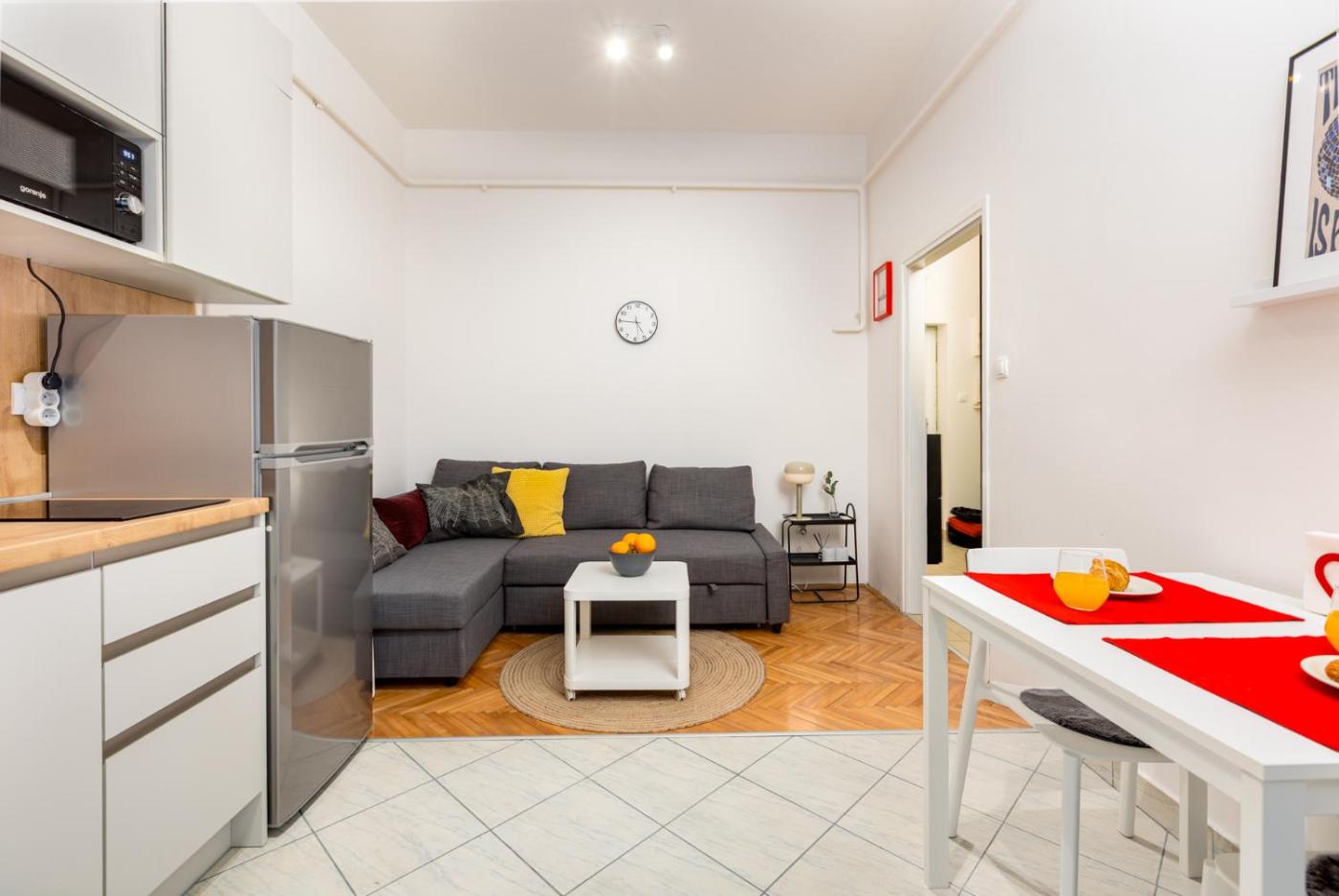 One-Bedroom Apartment. This apartment comes with 1 living room, 1 separate bedroom and 1 bathroom with a bath and free toiletries. Guests can make meals in the kitchen that features a stovetop, a refrigerator, a dishwasher and a microwave. The air-conditioned apartment features a flat-screen TV with cable channels, a washing machine, a coffee machine, a seating area as well as ancourtyard view. The unit has 2 beds.