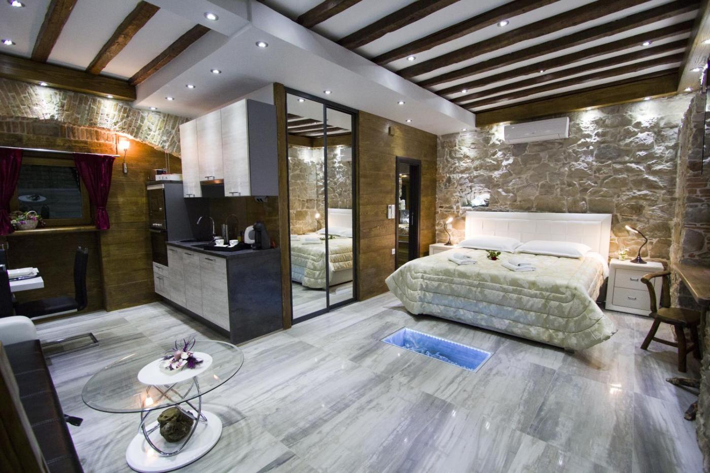 All accommodation units offer a seating area fitted with a flat-screen TV with cable channels. Modern interiors and exposed stone walls provide a sense of luxury and tradition, while the kitchenette and the bathroom are modernly equipped.