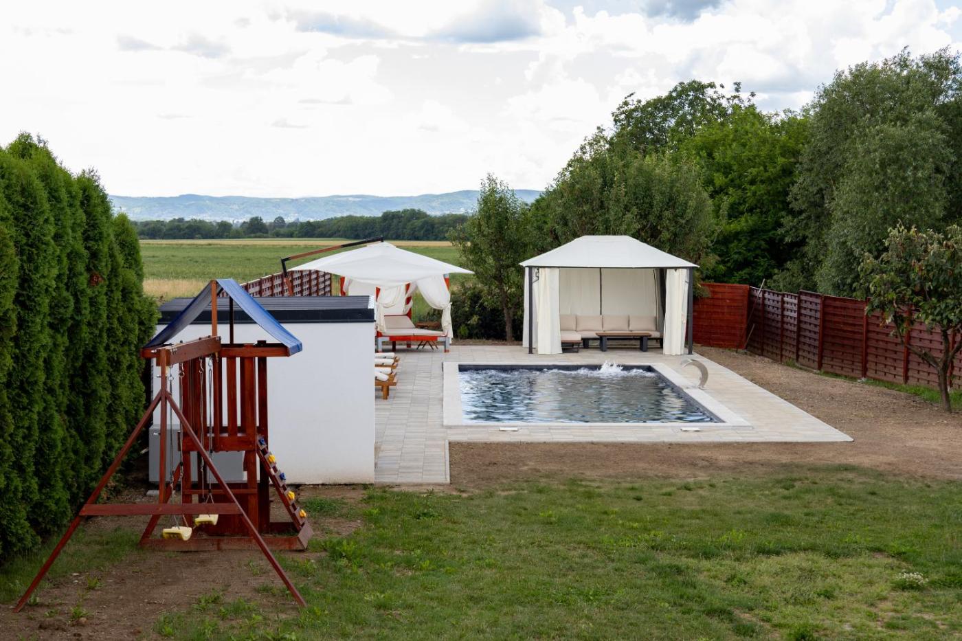 Four-Bedroom House. Guests will have a special experience as this holiday home features a pool with a view. Featuring a private entrance, this spacious holiday home also is comprised of 4 bedrooms, a seating area and 2 bathrooms with a bath and a shower. Guests will find a stovetop, a refrigerator, a dishwasher and kitchenware in the kitchen. The holiday home also has a barbecue. The air-conditioned holiday home offers a flat-screen TV with streaming services, a washing machine, a dining area, a wardrobe as well as garden views. The unit offers 9 beds.